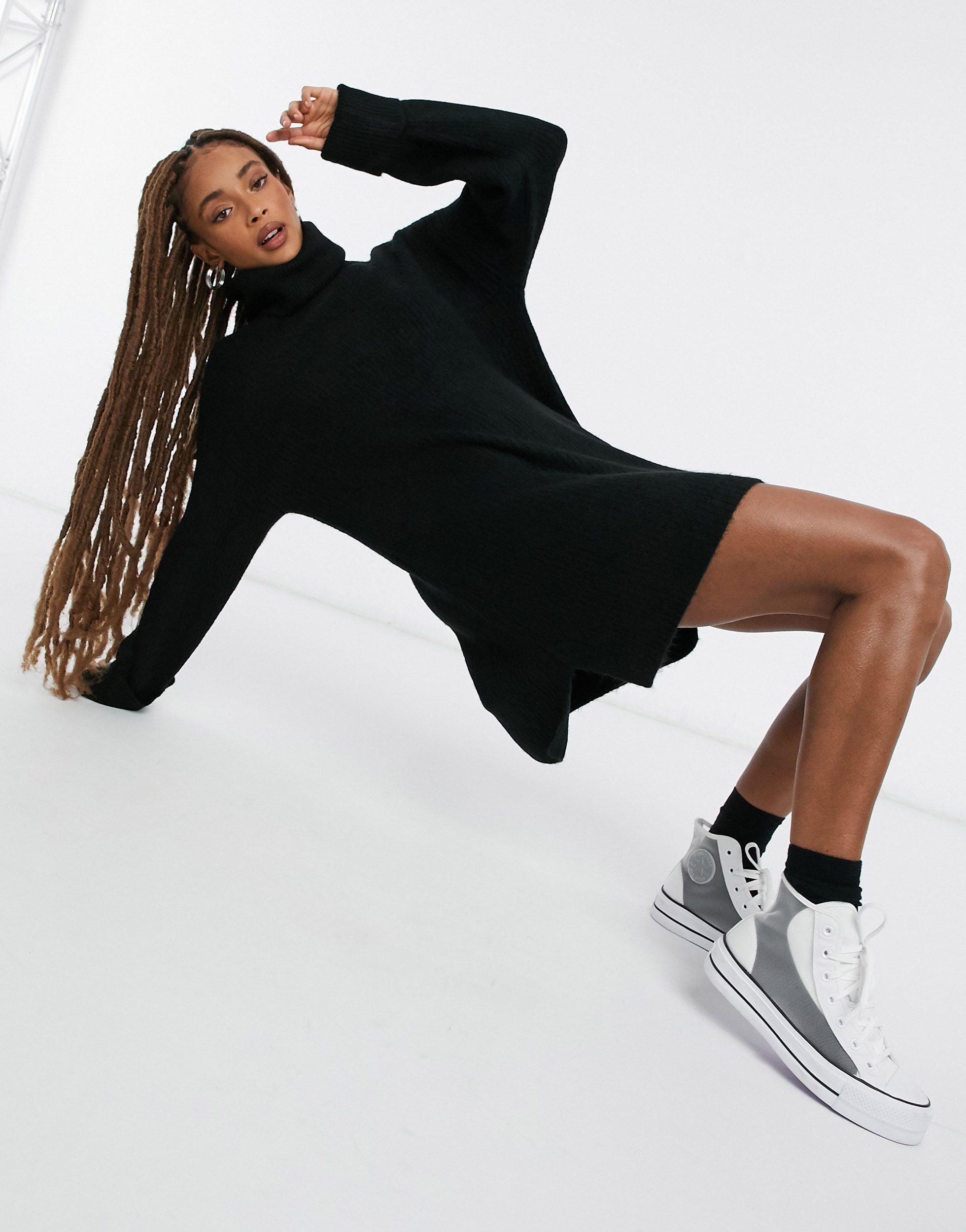 يضفي التريكو المضلع الضخم إحساسًا دافئًا على هذا الفستان القصير ذو الأكمام الطويلة. الرقبة وهمية.