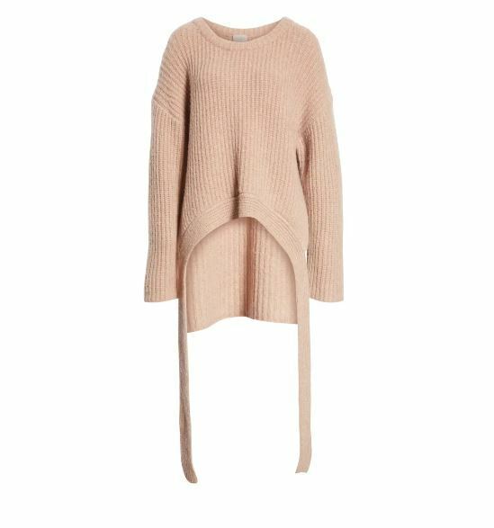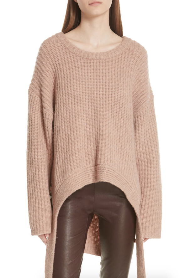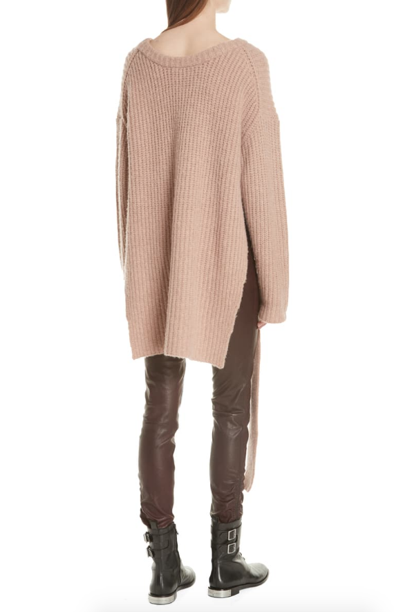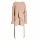 Dropped shoulders and extra-long sleeves amplify the oversized fit of this knit sweater with a curved hem that tapers dramatically down the sides in an oval shape.