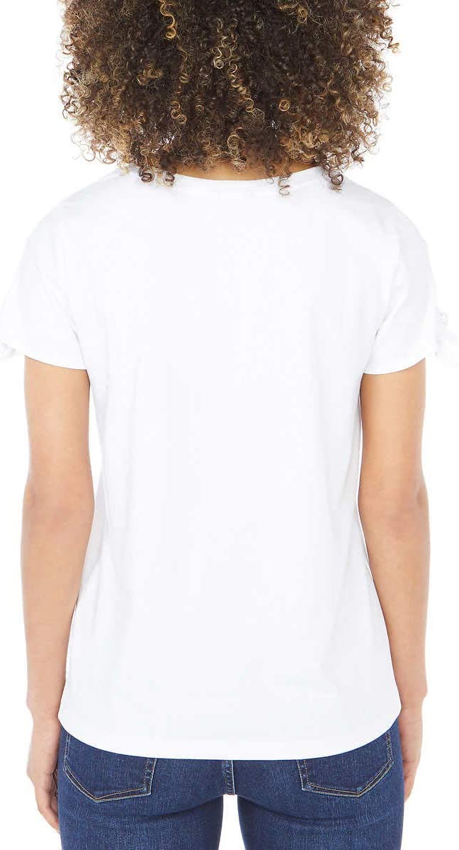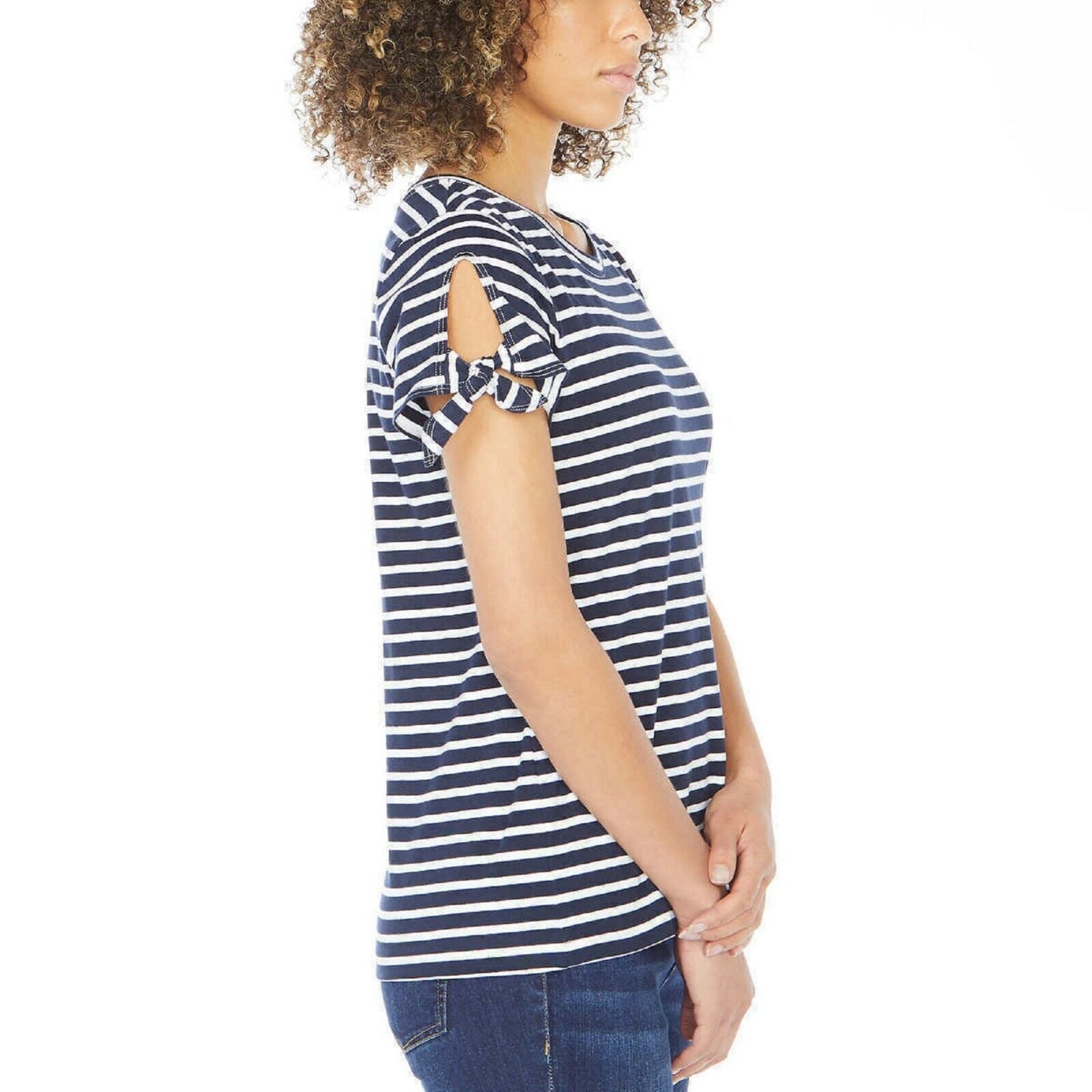 Nautica women's tie sleeve blouse with soft, breathable cotton, short sleeves, keyhole tie detail and crew neckline. navy colour. Key tie