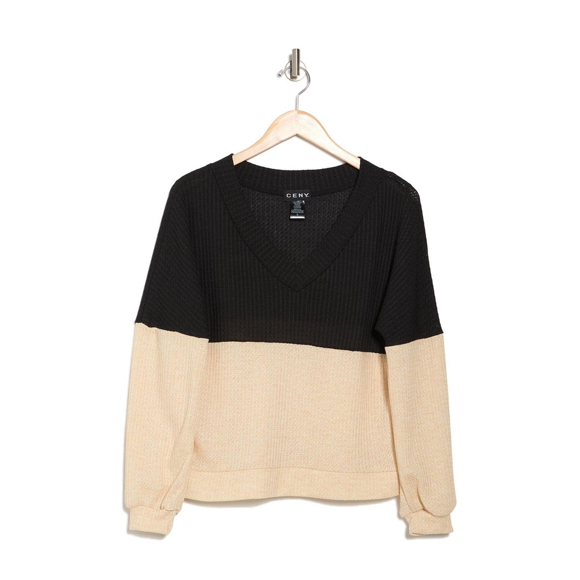 Classic V-neck sweater with color block detail and waffle-knit brown. V neck. long sleeves. It slides over the head. Color blocking. Striped neck, cuffs and hem. Waffle knit construction. almost.