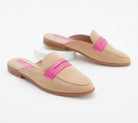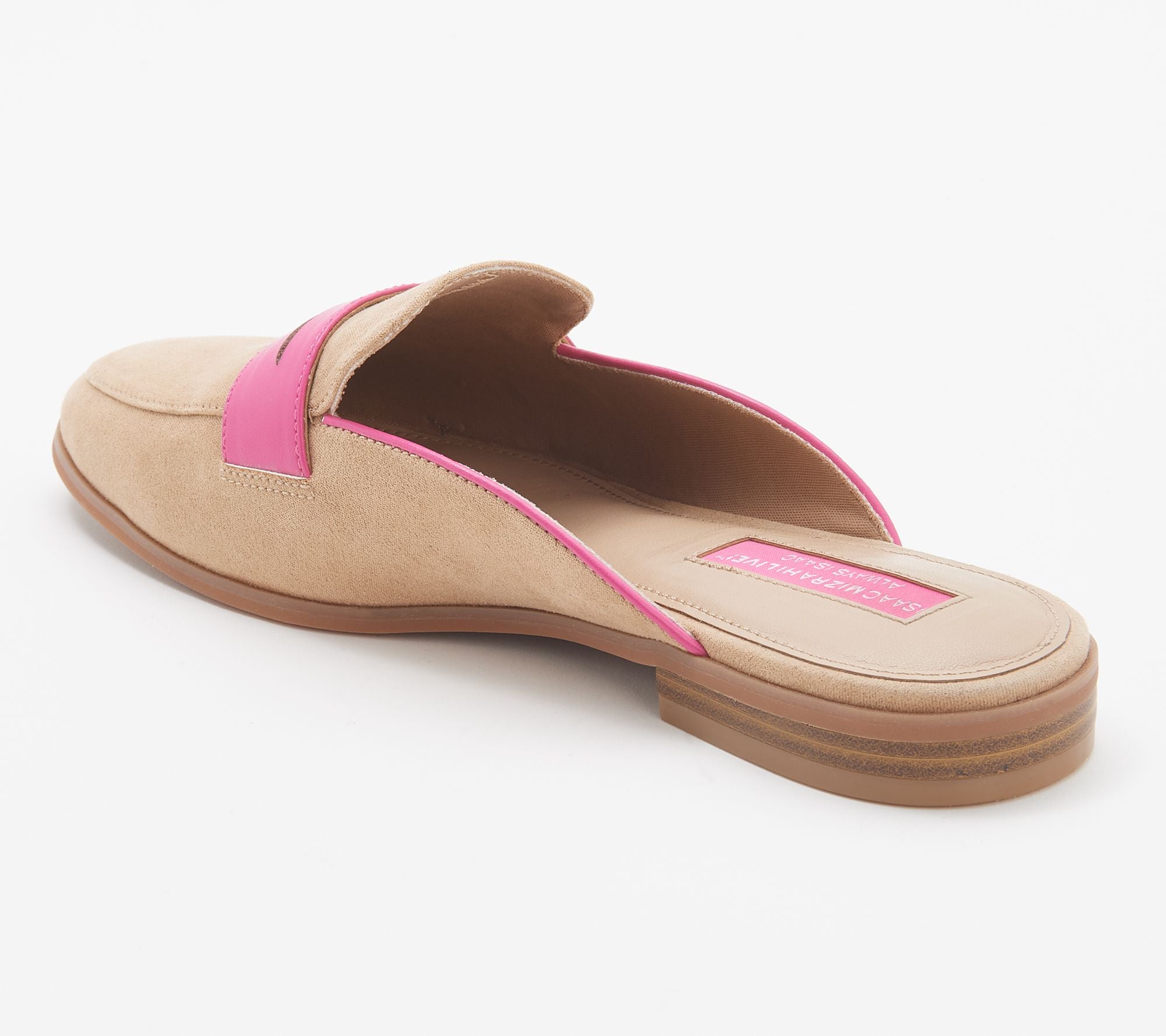 Make an entrance no one will forget with this gorgeous suede sandal enhanced with a pop of color. From Isaac Mizrahi Live!TM. Slip-on style, faux suede upper, contrasting case and piping